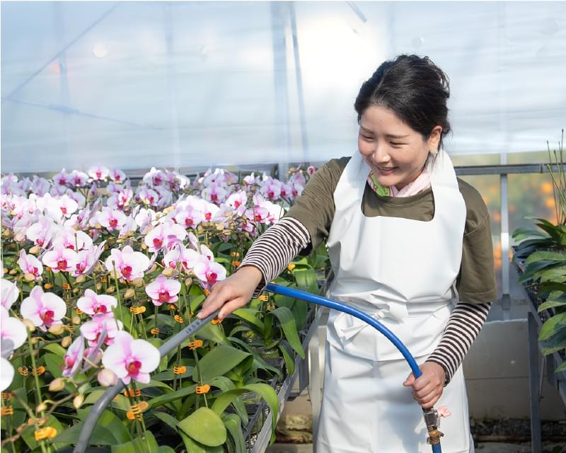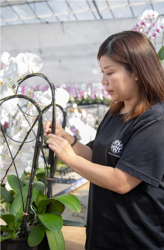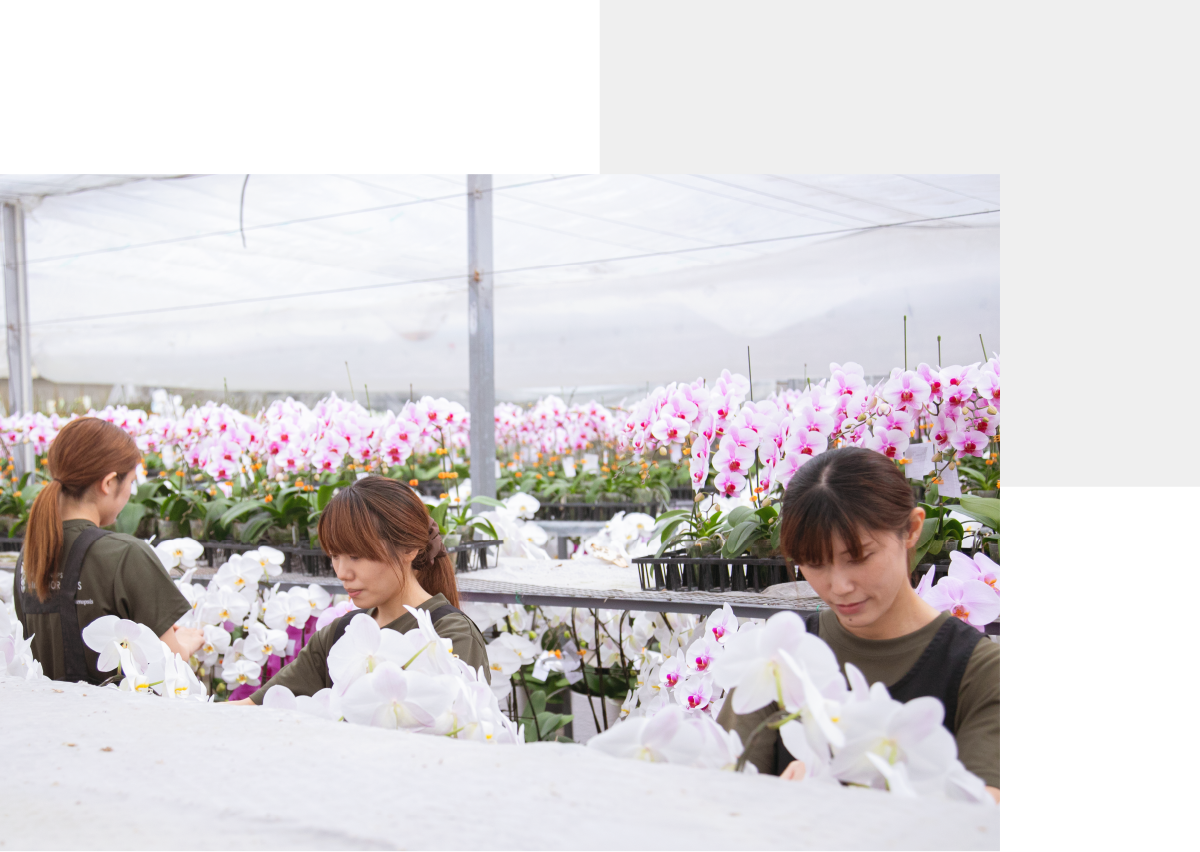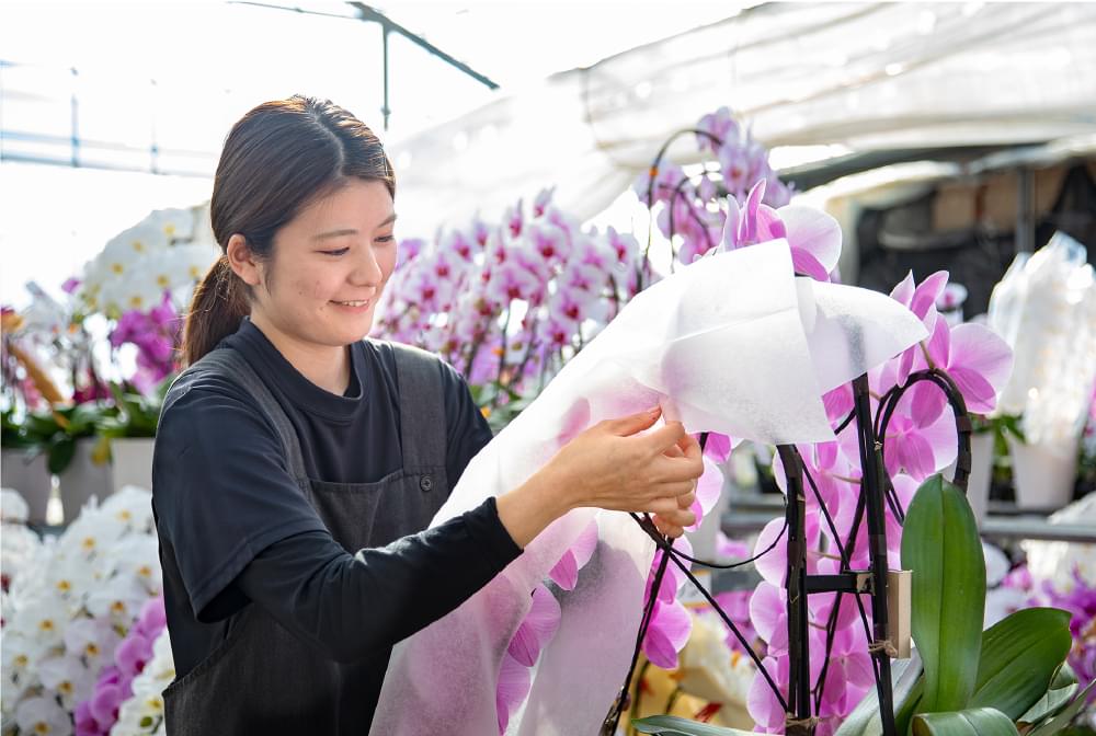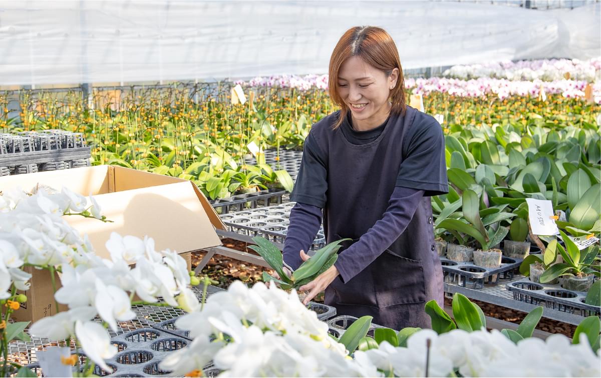 胡蝶蘭にふれるスタッフはみんなイキイキとしていて、表情もなごやか。